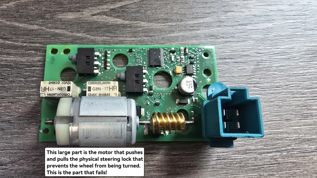 The circuit board also has a security chip (NEC) that counts every time the lock moves. If the motor struggles or gets stuck, the chip enters a ‘Fatal Error’ state as a theft-prevention measure. Once this happens, the car will stay immobilized even if the steering wheel is unlocked.