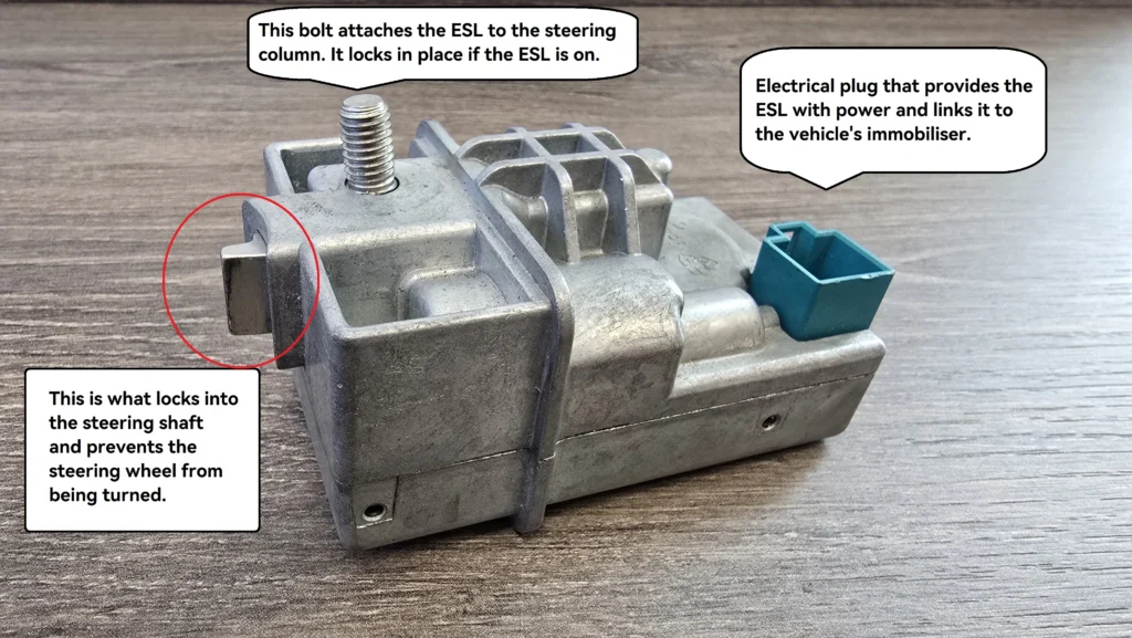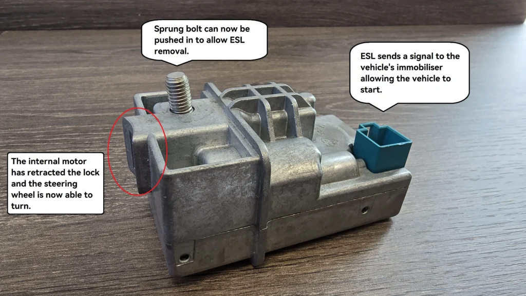 Above we can see the lock is in place preventing the wheel from being turned. The ESL in this state will also stop the handshake between the vehicle’s immobiliser (the EIS) and the ECU – preventing the vehicle from starting.
